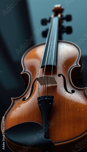 Intricate detailing of the wooden violin surface with water droplets highlighting the elegance and craftsmanship of the musical instrument
