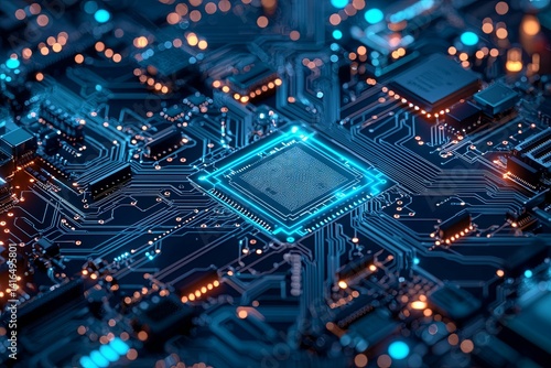 Intricate Details of a Modern Electronic Circuit Board with Glowing Elements and Complex Pathways Showcasing Advanced Technology and Innovation