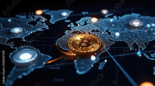 Intricate Digital Representation of Cryptocurrency with Bitcoin Coin on Global Map