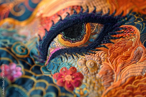 Intricate embroidery design with vibrant colors and patterns resembling a peacock feather