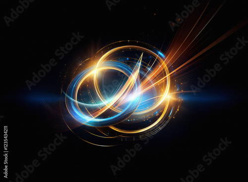 Intricate, glowing rings intersect, creating streaks of light against a dark background. The vibrant hues suggest energy and movement.