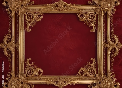 Intricate gold frame scrolls on deep red velvet , red, visual