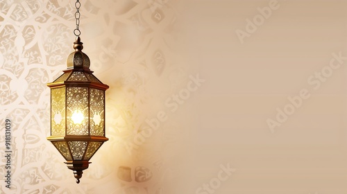 Intricate Golden Moroccan Lantern Hanging on a White Wall: A Symbol of Elegance and Tradition 精巧な黄金色のモロッコランタンが白い壁に吊り下げられています エレガンスと伝統の象徴です.Generative AI