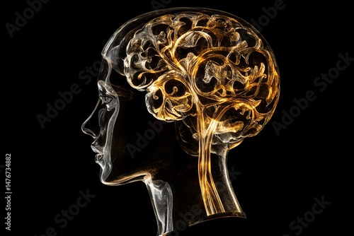 Intricate graphic of a head and brain with glowing patterns.