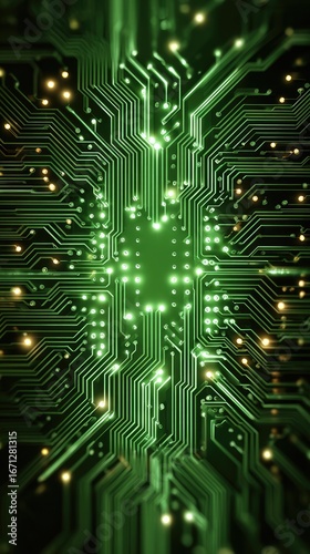 Intricate green circuit board, glowing lights