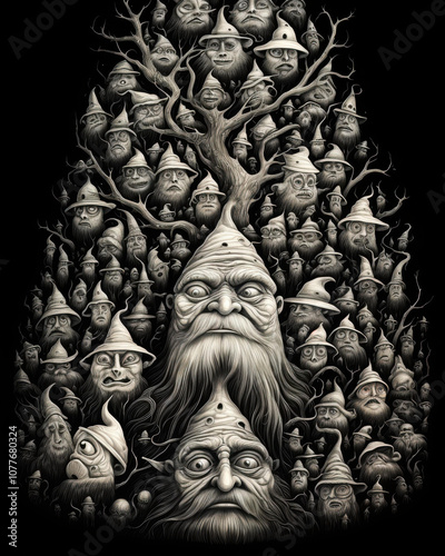 Intricate illustration featuring numerous wizard-like characters with unique expressions, intertwined with a gnarled tree ideal for fantasy-themed projects, book covers, or storytelling blogs,