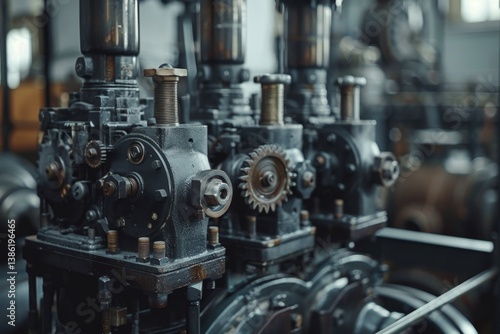 Intricate iron gears and pistons showcase the complexity of a steam engine from the Industrial Revolution era