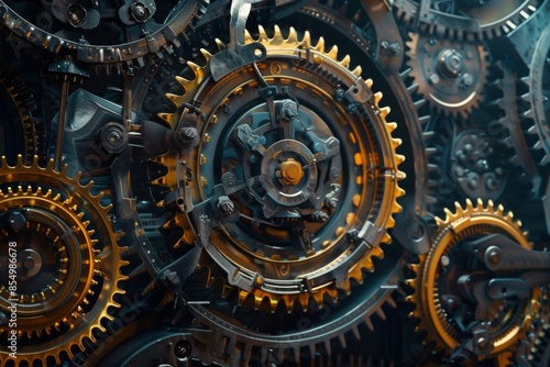 Intricate Machinery and Gears in Motion Representing the Inner Workings of Industry, Close-Up Digital Art Depicting Mechanical Precision and Industrial Engineering.