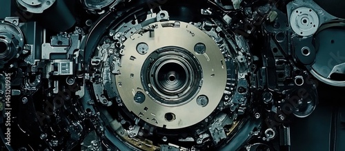 Intricate machinery close-up revealing a complex metallic mechanical arrangement