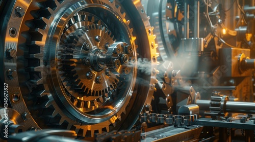 Intricate mechanical gears spin in unison gleaming with warm light steam rising showcasing precision engineering.