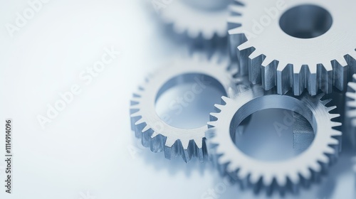 Intricate metallic gears interlock seamlessly, showcasing precision in engineering against a soft, blurred backdrop.