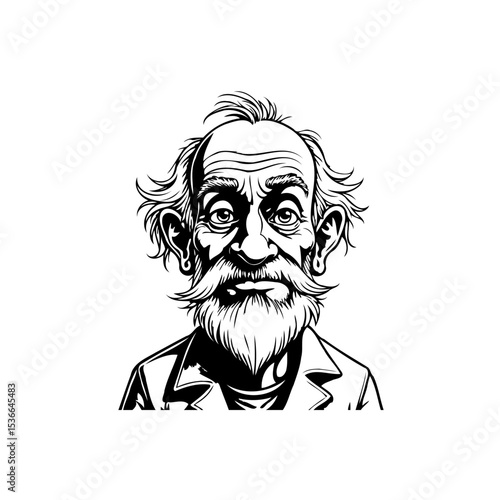 Intricate monochrome vector portrait of a wise, old man with detailed beard