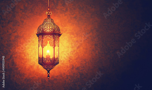 Intricate Moroccan Lantern Illuminating Warm Glow Against Textured Background, Exquisite Metalwork and Design, Perfect for Ambient Lighting.