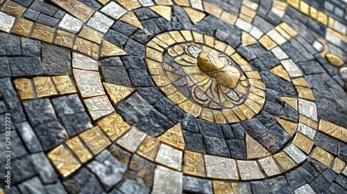 Intricate Mosaic Design with Metallic Elements and Patterns