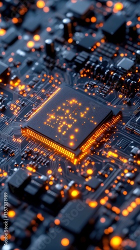 Intricate motherboard detail with glowing orange lights showcasing circuit board technology and innovation in a dark futuristic background