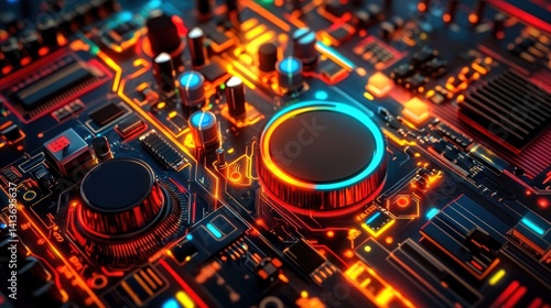 intricate motherboard detail with vibrant neon glows illuminating circuits and components in a futuristic technological landscape