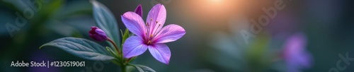 Intricate purple flower, delicate leaves, soft light, blossom, botanical