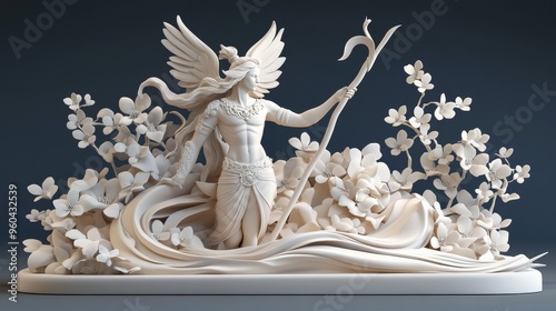 Intricate sculpture of a winged figure surrounded by delicate flowers, showcasing artistry and craftsmanship in elegant detail.