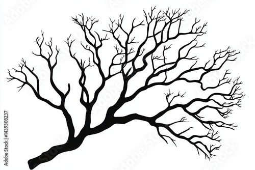 Intricate silhouette of a leafless tree branch with detailed twigs against a white background