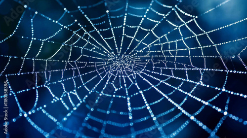 Intricate spider web glistening with dew drops, creating mesmerizing pattern in light. delicate structure showcases nature artistry and beauty