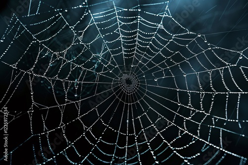 Intricate spider web glistening with dewdrops on a dark background, showcasing the beauty of nature