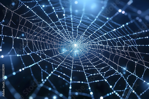 Intricate spider web illuminated by blue lights, symbolizing connection, complexity, network, and the delicate beauty of nature, glowing against a dark and mysterious background