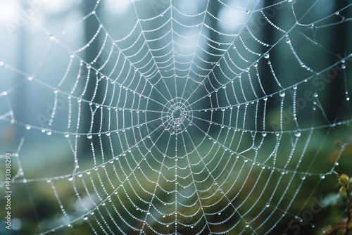Intricate spiderweb covered in dewdrops displaying nature's delicate beauty and detailed structure