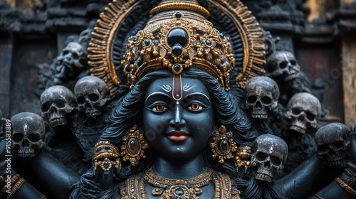 Intricate statue of Goddess Kali with a fierce expression, adorned with skulls and jewelry, against a backdrop of ancient temples.