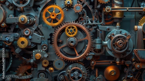 Intricate steampunk machinery with gears, cogs, and levers in a vintage industrial setup, showcasing meticulous engineering and craftsmanship.