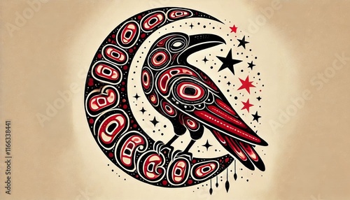 Intricate Tribal Art of a Raven Perched on a Crescent Moon with Stars
