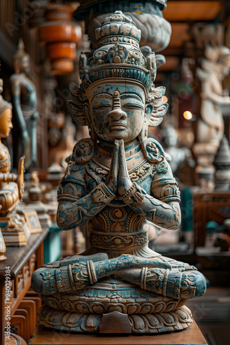 Intricately Carved Meditative Statue in Traditional Pose: Ornate Wooden Sculpture of a Praying Deity in a Rustic Antique Shop Setting