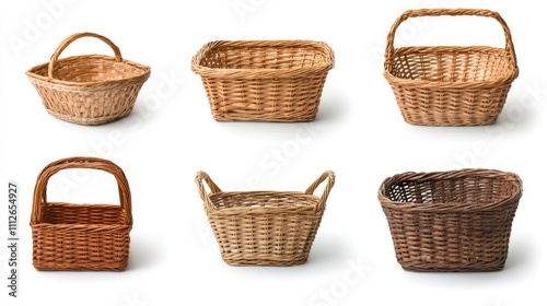 Intricately crafted wicker baskets displayed artistically against a crisp white backdrop