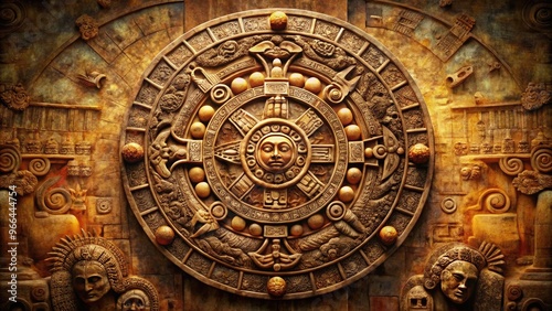 Intricately designed ancient Mesoamerican calendar wheel featuring 18 months, 13 cycles, and symbolic glyphs, adorned with feathers, flowers, and serpents, against a rich, textured background.