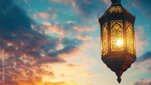 Intricately Designed Lantern Illuminated Against a Stunning Sunset Sky Filled with Clouds and Light