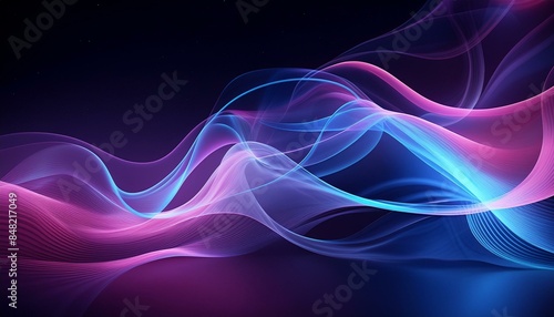 Intricately flowing pink blue purple waves on black background. Smooth curvy shape fluid background. Transparent smooth wave. Colored smoke whiffs and swirls