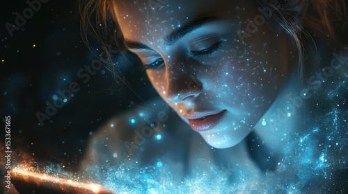 Intrigued woman bathed in soft blue light, gazing at device with sparkling particles creating ethereal, dreamy