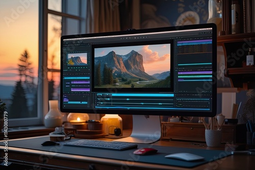 Intuitive Video Editing Software on Stunning Monitor in Vintage Home Office at Dusk