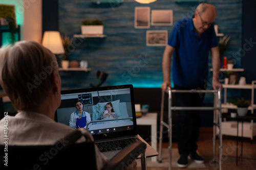 Invalid old woman holding laptop with video call talking to doctor and little girl in hospital ward. Disabled person in wheelchair using device for online remote conference at home