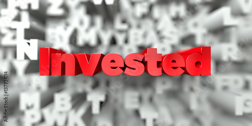 Invested - Red text on typography background - 3D rendered royalty free stock image. This image can be used for an online website banner ad or a print postcard.