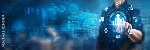 Investment. Businessman touching portfolio diversification strategies, risk management techniques, capital allocation decisions, market analysis, investment performance, long-term growth potential.