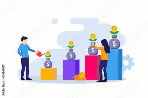 Investment concept, people watering money tree with coins, increase financial investment profit vector illustration. Flat vector template Style Suitable for Web Landing Page, Background.