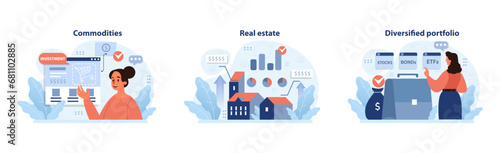 Investment strategies set. Enthusiastic woman explores commodities, focused man evaluates real estate potential, and a professional weighs diversified portfolio options. Flat vector illustration.