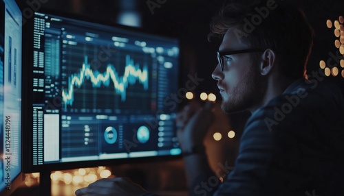 Investor Analyzing Stock Market Financial Reports And Kpis With Business Intelligence Analytics And Graphs On Computer Screen In Office.