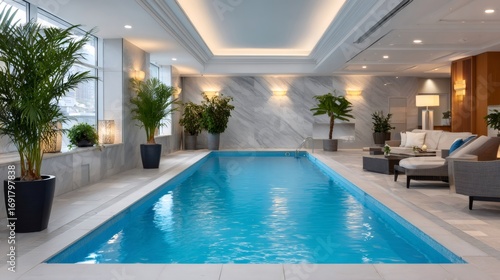 Inviting indoor swimming pool with turquoise water surrounded by potted plants