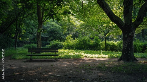 Inviting visitors to enjoy the peacefulness of a bright green summer park, an empty bench awaits