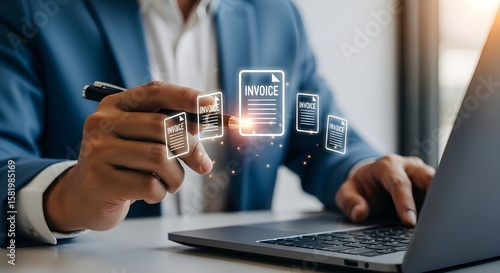 Invoice Management with Businessman Using Laptop and Digital Pen | Online Accounting, Finance and E-billing System for Business Efficiency