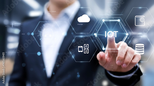 IOT, business suit interacting with a futuristic IOT interface, Internet of Things, smart technology, digital interaction, IoT integration
