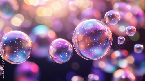 Iridescent Bubbles with Glittering Specks Against a Blurred Background
