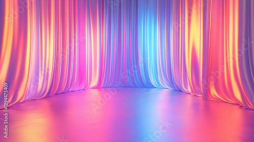 Iridescent holographic empty stage backdrop with glowing pastel curtains for glamorous events and luxury presentations