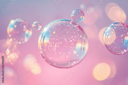 Iridescent soap bubbles float in a dreamy pink bokeh, capturing light and creating a magical, ethereal scene.